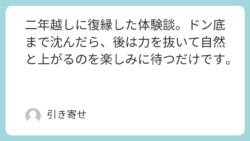 復縁 二年越しに復縁した体験談。ドン底まで沈んだら、後は力を抜いて自然と上がるのを楽しみに待つだけです。
